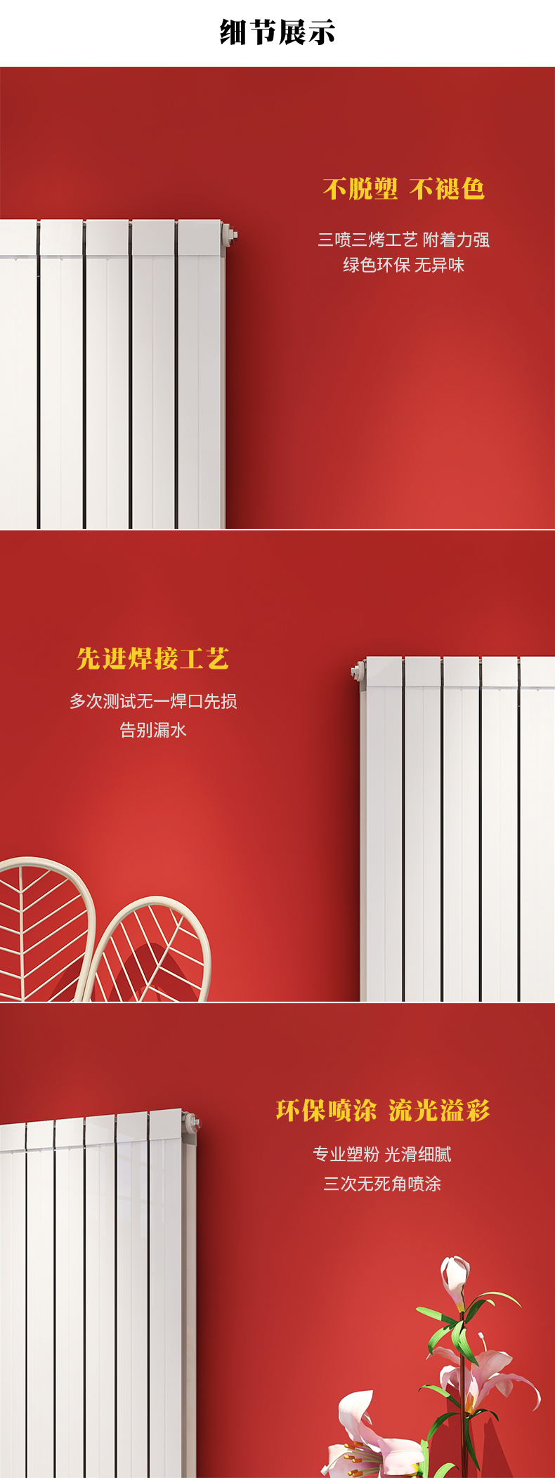 3、克服了鑄鐵散熱器承壓低、金屬熱強(qiáng)度低、裝飾性能差的缺點(diǎn);