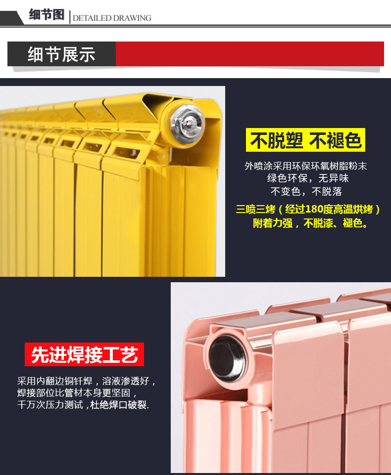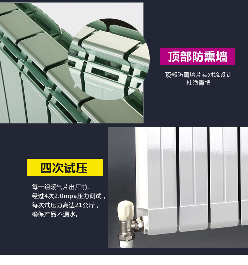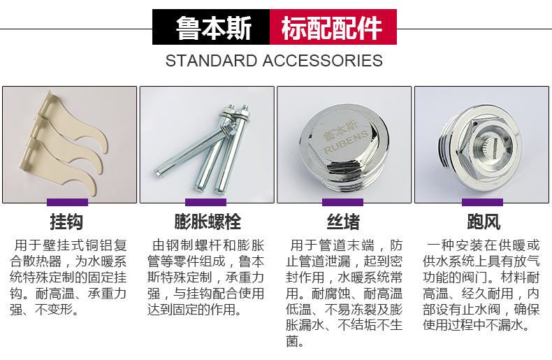 魯本斯銅鋁復合列賓系列暖氣片散熱器,獨特的防熏墻設計,有效的減輕墻面的熏黃與熏黑;材料升級,內腔銅管采用“冷軋拉伸紫銅管”,新型高強度紫銅管,目前只有魯本斯在使用;冷軋拉伸紫銅管+鋁鎂合金,散熱量超大,適合任何供暖系統,一輩子不用更換;表面經過20道工序處理,外噴涂采用美國立邦粉末涂料,亮光度達98%,永恒經典的外觀設計,可與任何裝飾風格匹配;該款產品出廠前均在21公斤壓力環(huán)境下試壓四次,保證產品無論任何情況下都不會爆裂免除后顧之憂!
